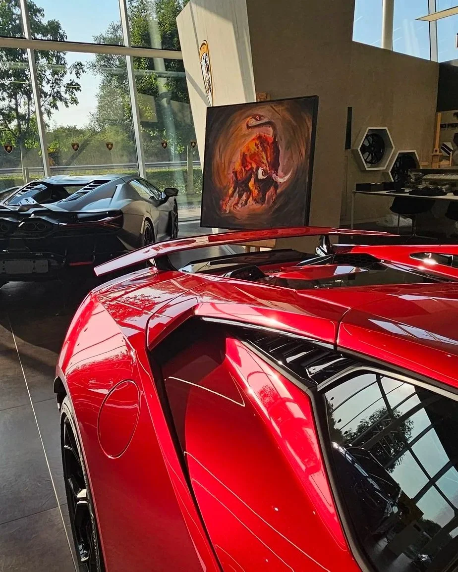 “The new series of paintings inspired by the Lamborghini Raging Bull represents a powerful fusion of raw energy and elegance, capturing the essence of the human spirit’s relentless pursuit of excellence. Created using a combination of oil and spray paint, these dynamic artworks embody the daring and disruptive nature of Lamborghini’s iconic symbol while pushing the boundaries of traditional artistic mediums. The spray paint’s vivid, electric colours mirror the speed, audacity, and power of the Lamborghini, while the oil paint adds depth and a tactile richness, symbolizing the timeless pursuit of perfection.”